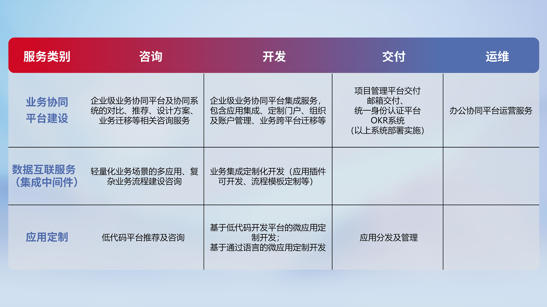 针对钉钉、、、、企微、、、IDaas等平台级产品提供产品的规划、、、、方案、、、、交付、、、定制化开发等服务,,,实现如统一协同办公、、、、智能客户服务、、、混合会议管理、、、、智能数据查询、、等业务场景,,实现数字化转型。。